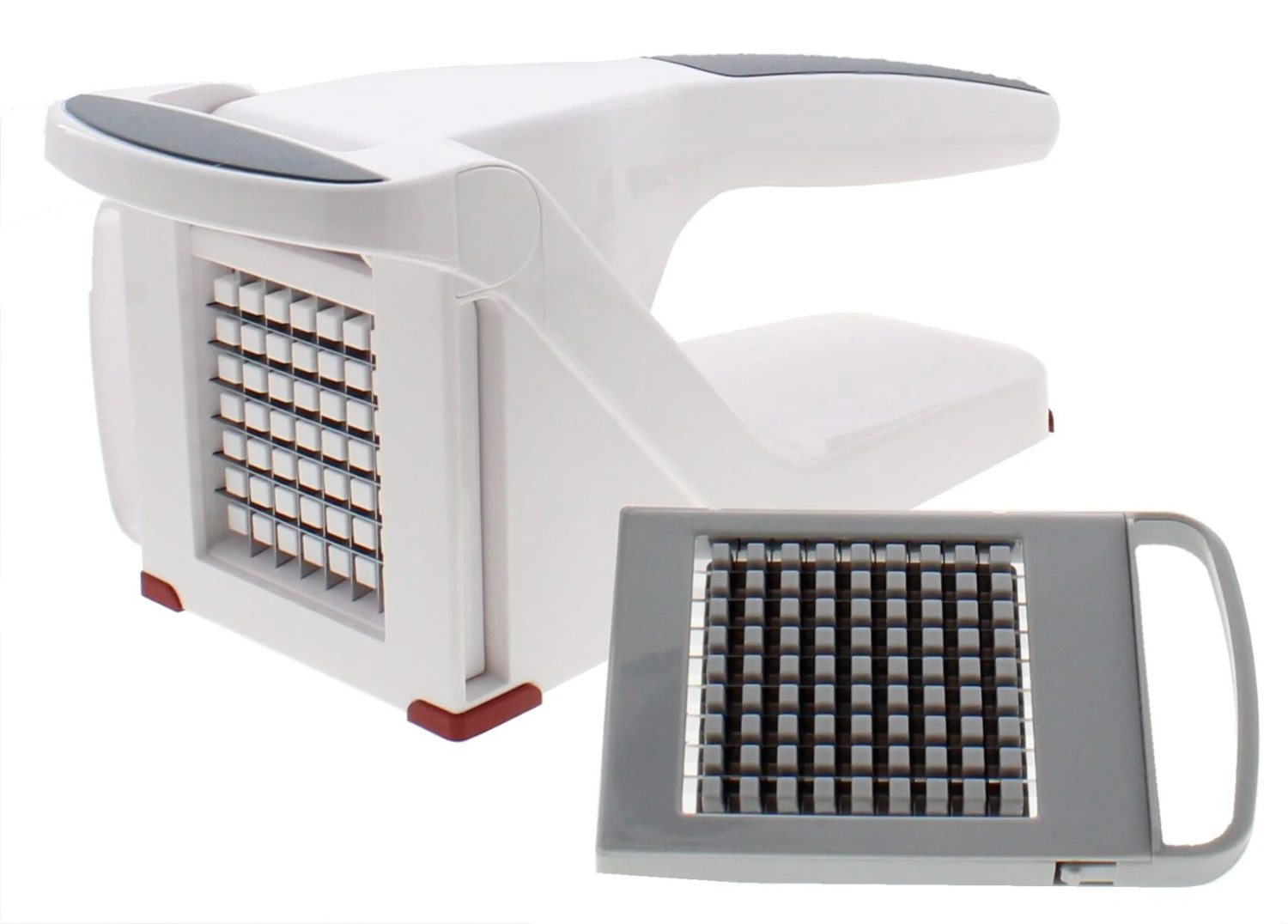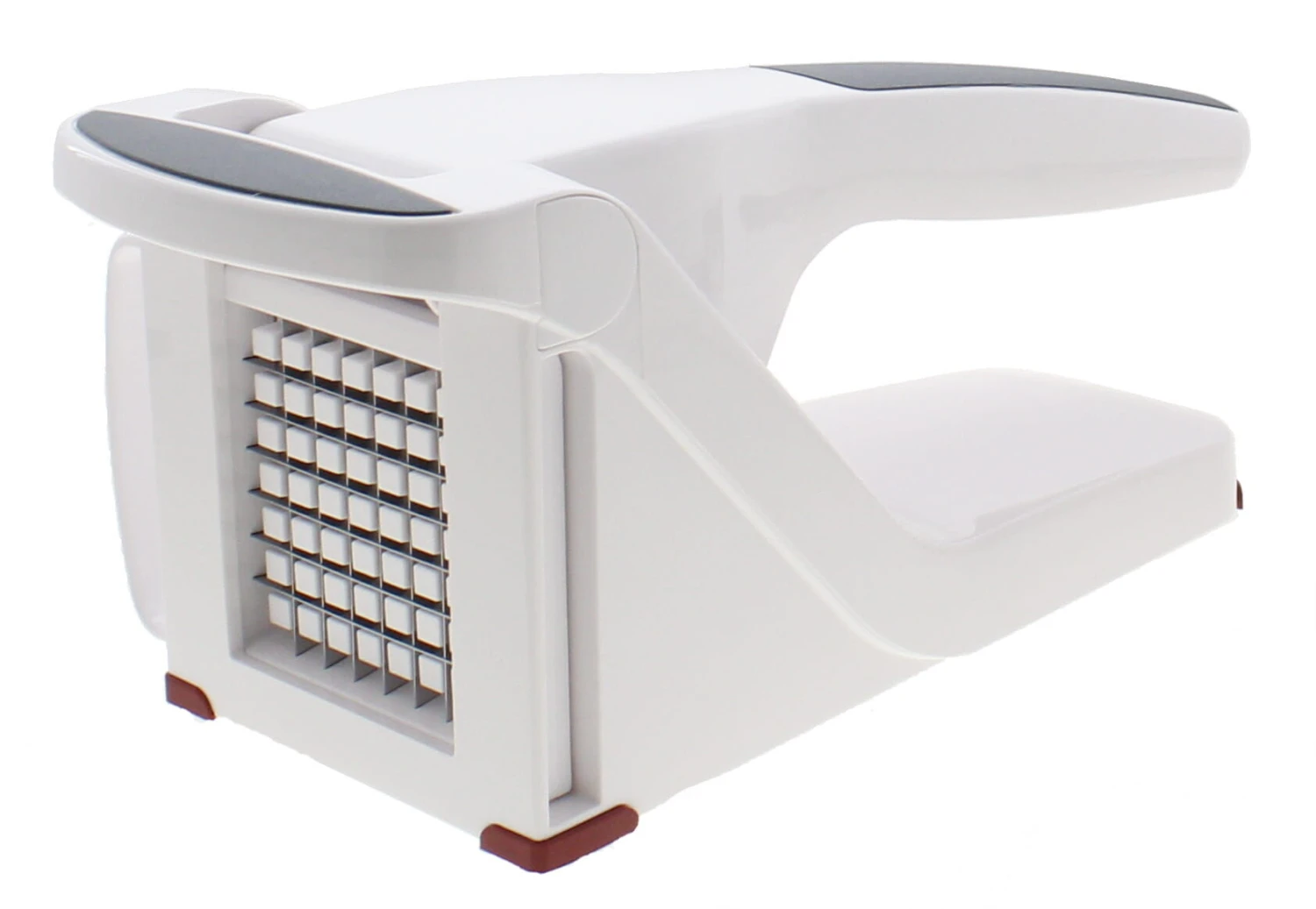 De frietsnijder heeft een kunststof behuizing en wordt geleverd met roestvrijstalen messen in verschillende formaten. De werking van de snijder is heel eenvoudig. U plaats een aardappel in de pers, drukt de hendel naar beneden en de groente wordt eenvoudig met een minimale inspanning door de messen gedrukt.